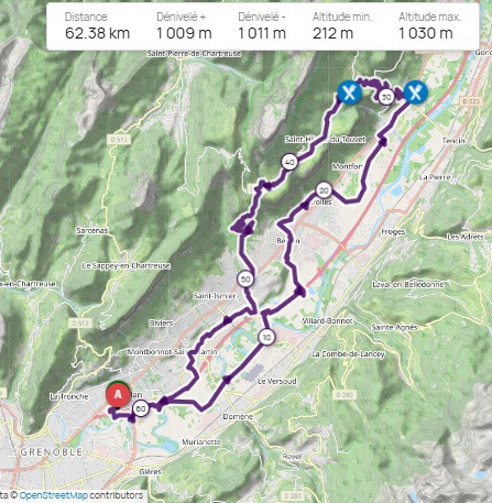 Contrôle-ravitaillement à La Terrasse. Ce circuit emprunte directement la montée vers Saint Bernard du Touvet. Retour par le plateau des Petites Roches, Meylan, Crolles, La Terrasse, St Bernard du Touvet, Saint Pancrasse, Saint Nazaire les Eymes, Meylan.